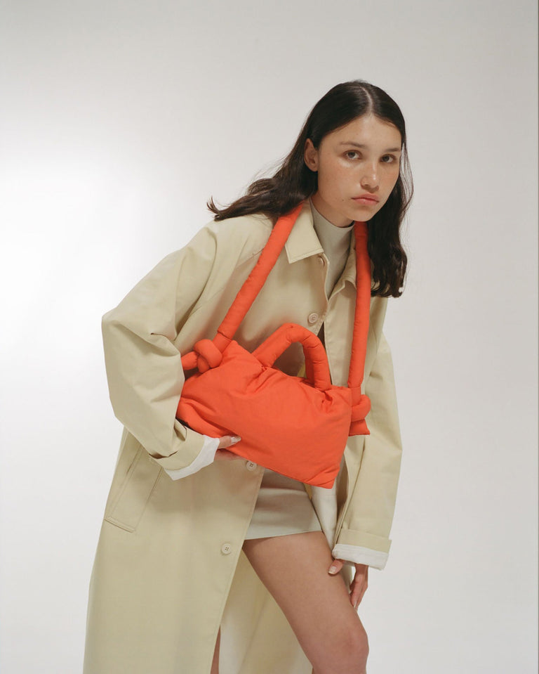 Coral Miniona soft bag from the Olënd brand. It is the small version of their Ona bag. Puffy and light, it's perfect for carrying your essentials.
