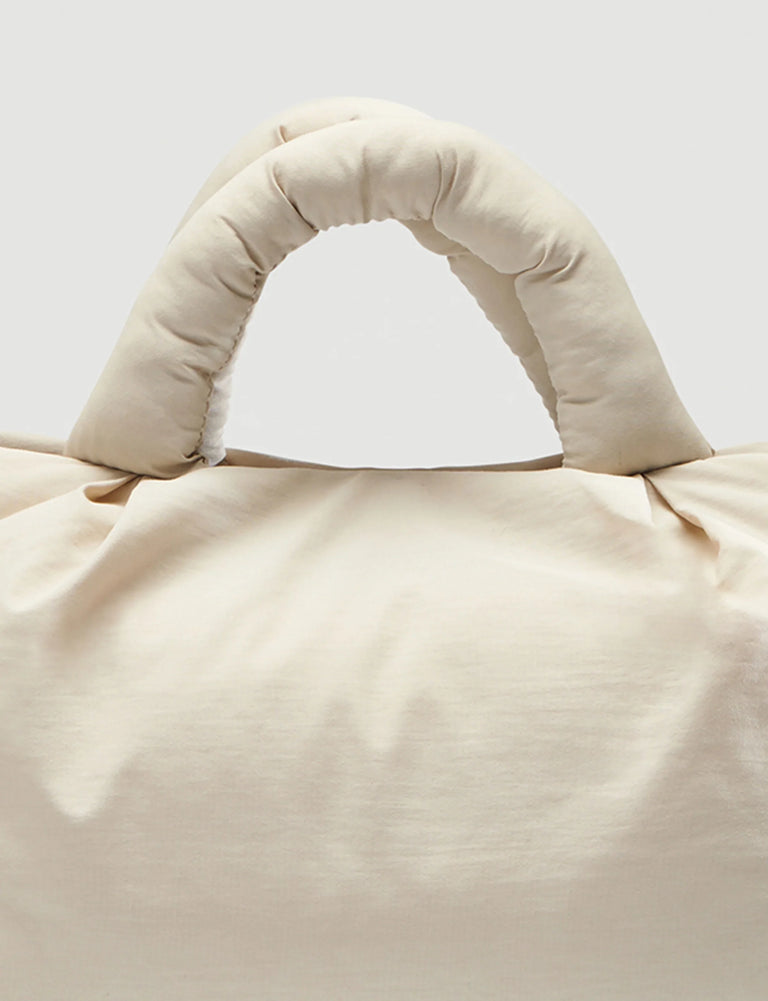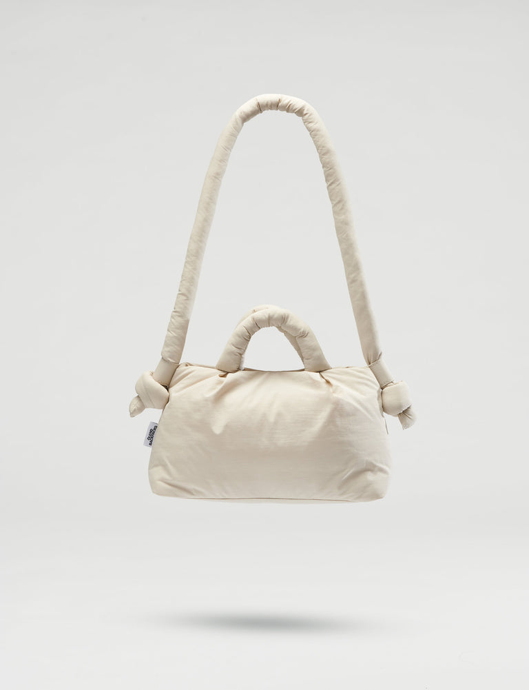 Sand Miniona soft bag from the Olënd brand. It is the small version of their Ona bag. Puffy and light, it's perfect for carrying your essentials.