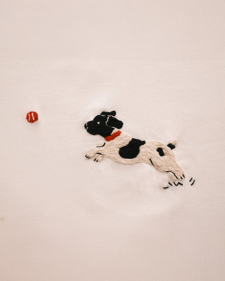 Camiseta blanca Aaron hecha de algodón orgánico y bordada a mano por la artista Elia Flores Fraile.