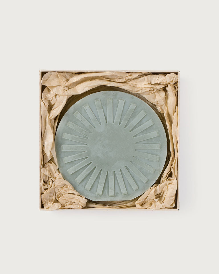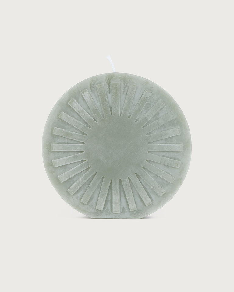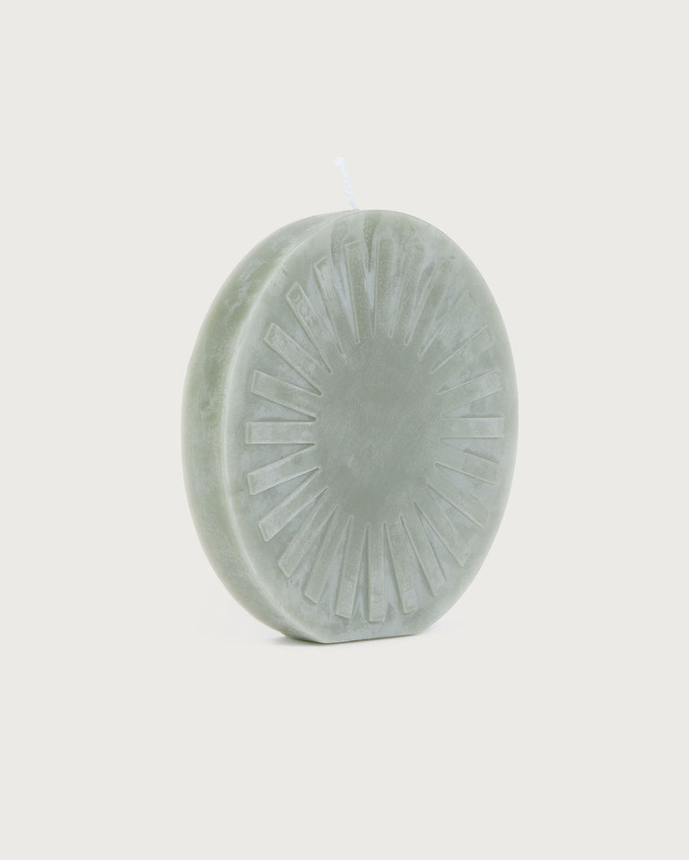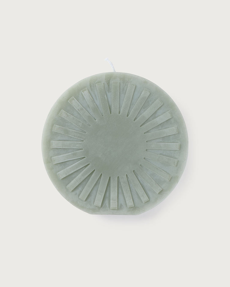 Vela azul circular Sol Thinking MU producida por Copito. Cada vela es única en su forma, tamaño y color, ya que todo está hecho a mano utilizando pigmentos vegetales que a veces pueden producir una variación de color impredecible.