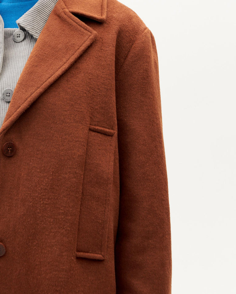 →ラペルカラー→長袖→レギュラーフィット→ 前開きはボタン付き→胸の高さの縦型フラップポケット→ 詳細: フラップの上部にボタンがあり、開閉をより適切に調整できます。 → 生地: ウール、重量 545 gsm (厚い生地) → 内側: 100% リサイクルポリエステル裏地付き→ 着丈:ミディ丈